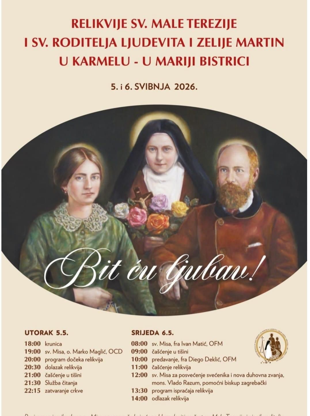 Relikvije svete Male Terezije i svetih roditelja Ljudevita i Zelije Martin u Karmelu - u Mariji Bistrici 5. i 6. svibnja 2026.